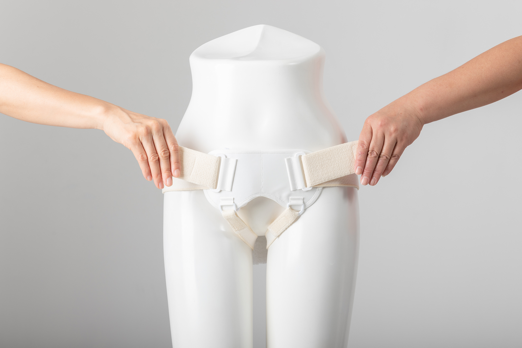 下着をはくように身につけ、ウェストベルトを締めてください - 仰向けに寝た状態でヘルニア部を落ち着かせ、ご自身に合ったスポンジの数に調節しパッドを面板の裏側に装着してください(スポンジは3枚まで挿入可能)