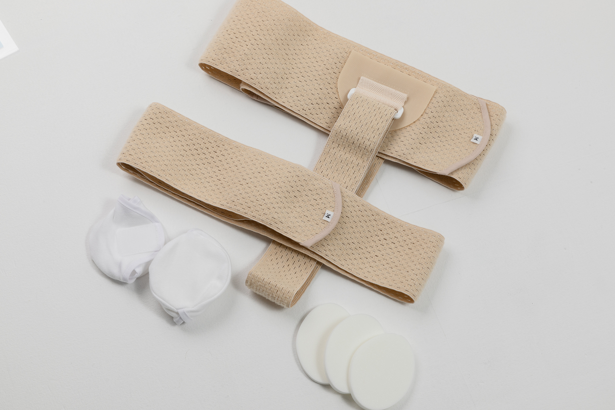 - 仰向けに寝た状態でヘルニア部を落ち着かせ、ご自身に合ったスポンジの数に調節しバッドを細ベルトの裏側に装着してください(スポンジは3枚まで挿入可能)